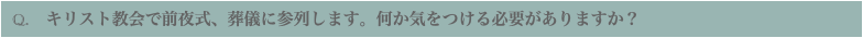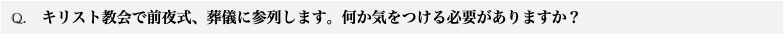 香典、ご霊前にあたるものは「お花料」と呼びます。お焼香はいたしませんが、お花を手向ける「献花」をすることがあります。キリスト教では、死を「忌むべきこと」とは考えませんので、お清め塩のようなものをお配りすることはいたしません。